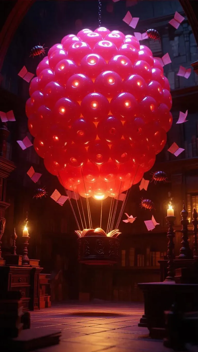 A mystical balloon nestled within a colossal raspberry core, illuminated by glowing fruit scrolls that emit a soft, warm light. Flying bookworms dance around the scrolls, creating a whimsical and enchanting atmosphere. The walls are lined with ancient artifacts and intricate carvings, enhancing the magical ambiance.