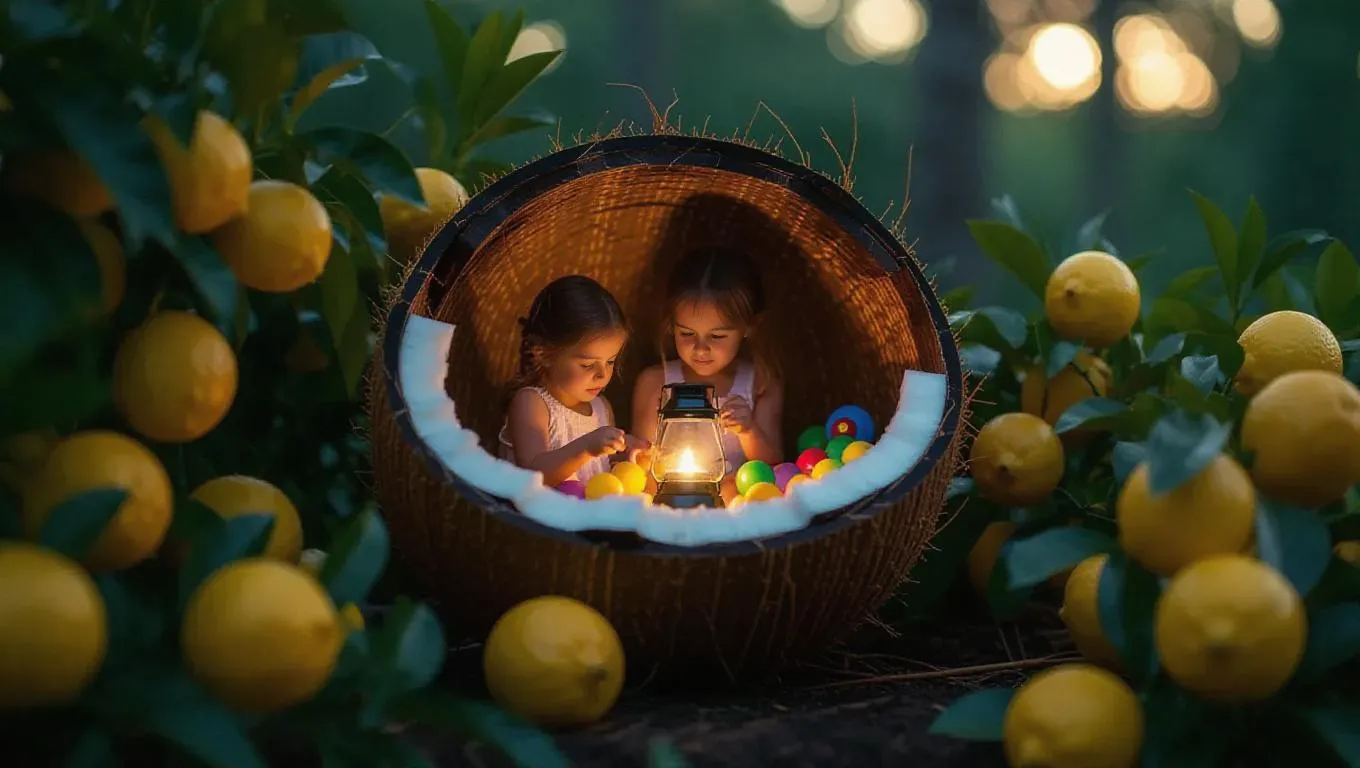 A cozy cabin crafted from a halved coconut, nestled among vibrant lemon bushes. Inside, a girl plays with colorful toys, the warm glow of a small lantern casting a gentle light, creating a serene and enchanting atmosphere