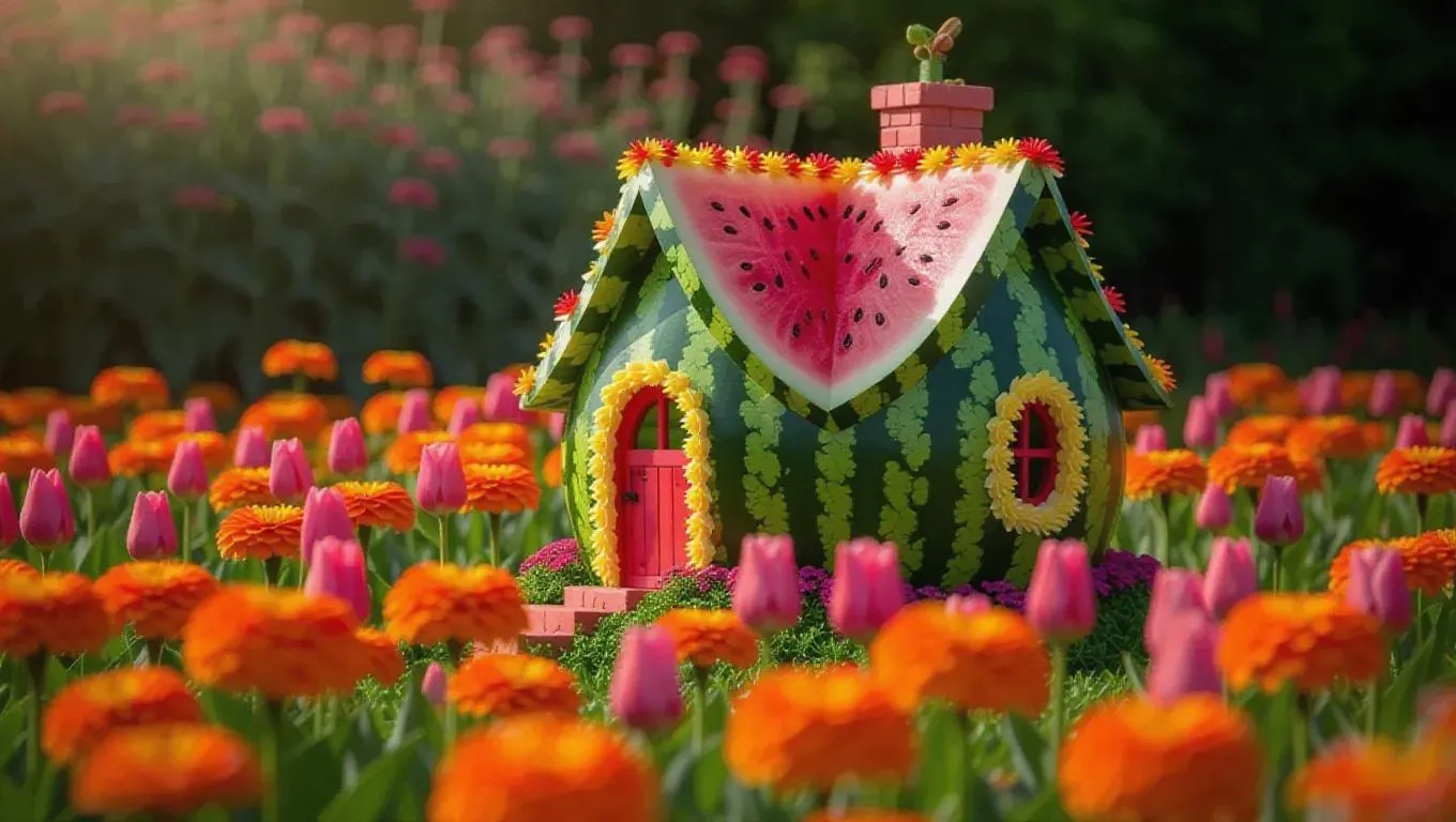 A whimsical little cottage crafted from plump watermelons and creamy frosting, nestled in the heart of a lush zinnia field, surrounded by a sea of vibrant orange zinnias and delicate tulips, exuding a sweet, enchanting smell under the bright light of a sunny day.