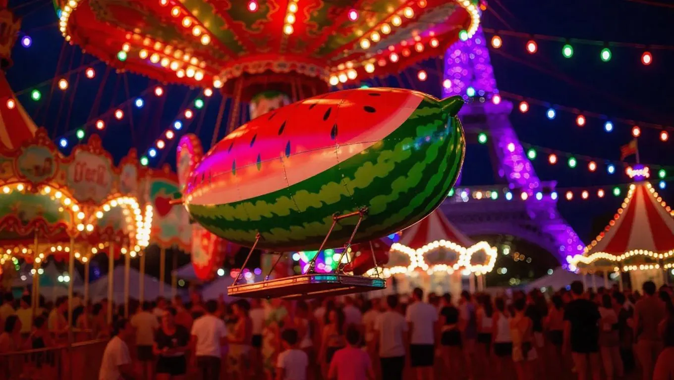 A whimsical watermelon-shaped blimp gracefully gliding through a vibrant carnival scene, carrying delighted travelers. The blimp's vibrant green and red hues contrast with the bright colors of festive lights, creating a surreal and enchanting atmosphere. Laughter fills the air, casting a joyful spirit that enhances the magical journey