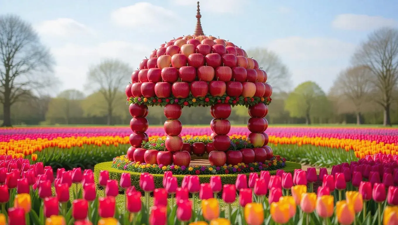 A whimsical little pavilion crafted from plump apples and sugary icing, nestled in the heart of a vibrant tulip garden, surrounded by a sea of colorful tulips and cheerful daisies, exuding a sweet, enchanting aroma under the bright afternoon sun.
