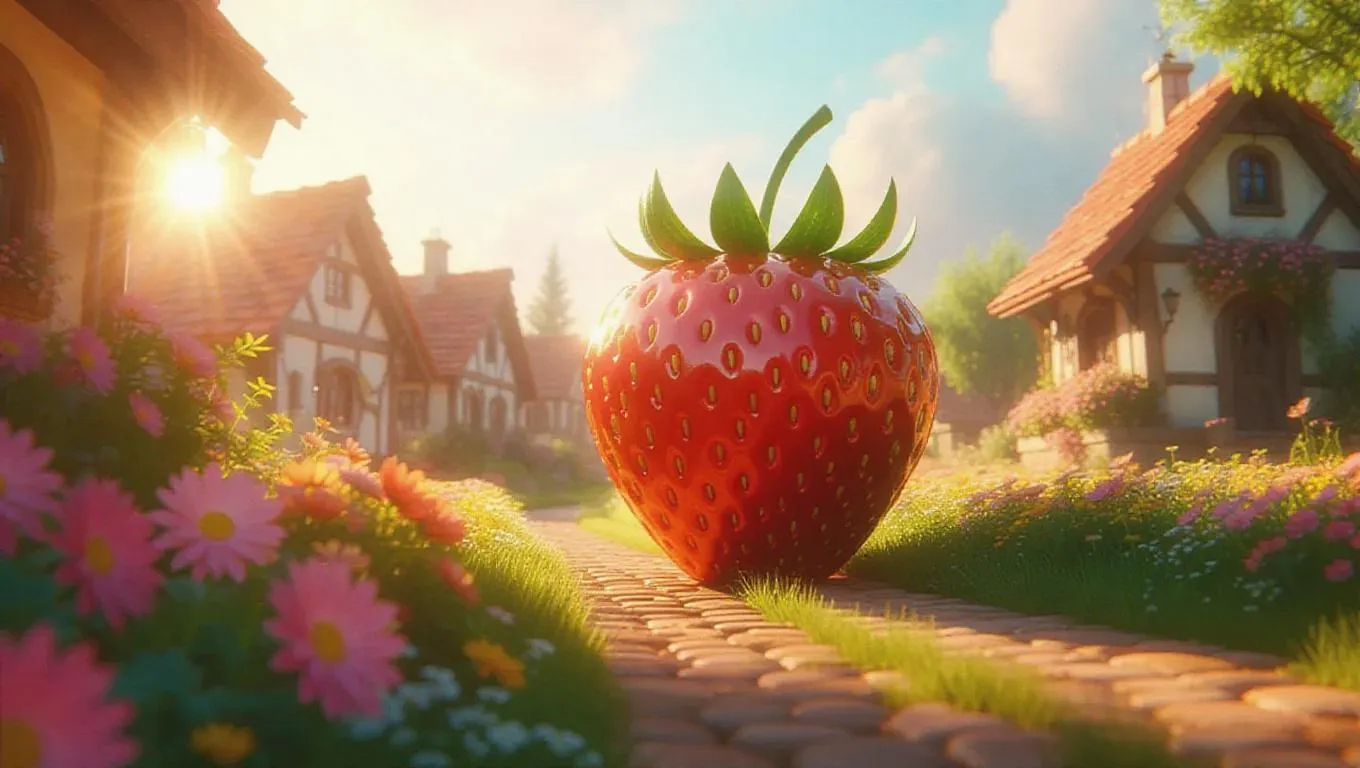 A fantastical strawberry-shaped ride cruising through a serene village designed with bright flower gardens, creating a delightful magical trail of glittering berry dust, as sunbeams shine through soft-hued heavens and pleased villagers greet from bloom-inspired homes