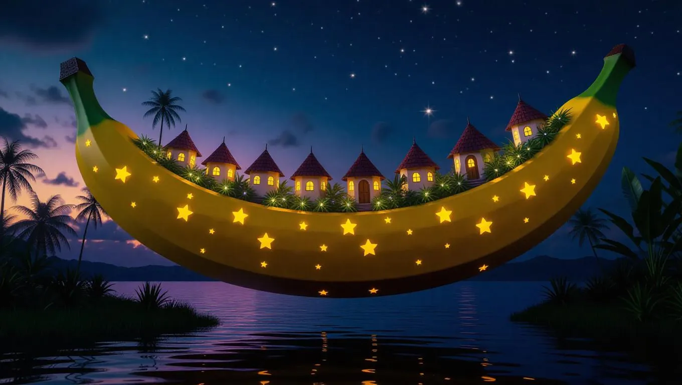 A fantastical floating landscape shaped like a giant banana, adorned with tiny star-shaped homes and rivers flowing with tropical punch, drifting under a twilight sky, with shimmering stars and a gentle stir.