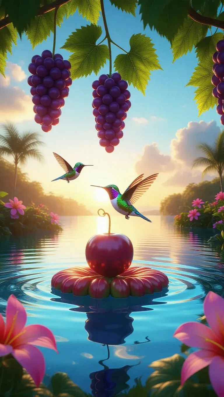 A hummingbird flutters beneath a sunlit grape umbrella on a vibrant floating radish raft, surrounded by calm, sky-blue waters, with vivid tropical blooms and a striking sunset planting warm hues across the horizon.