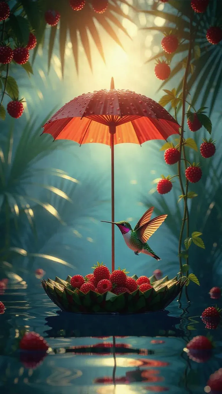 A hummingbird flutters beneath a charming raspberry umbrella on a surreal floating starfruit raft, surrounded by tranquil, deep-blue waters, with robust tropical vines and a blazing sunset throwing a golden light.