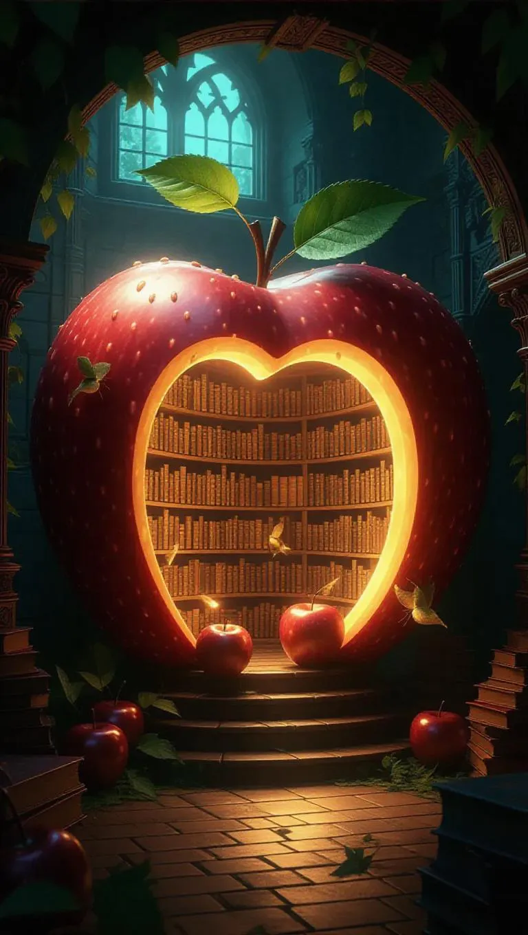 A mystical library nestled within a colossal apple core, illuminated by glowing fruit scrolls that emit a radiant light. Flying bookworms sip juice from the scrolls, creating a fantastical and enchanting atmosphere. The walls are lined with mystical glyphs and intricate carvings, enhancing the magical ambiance.