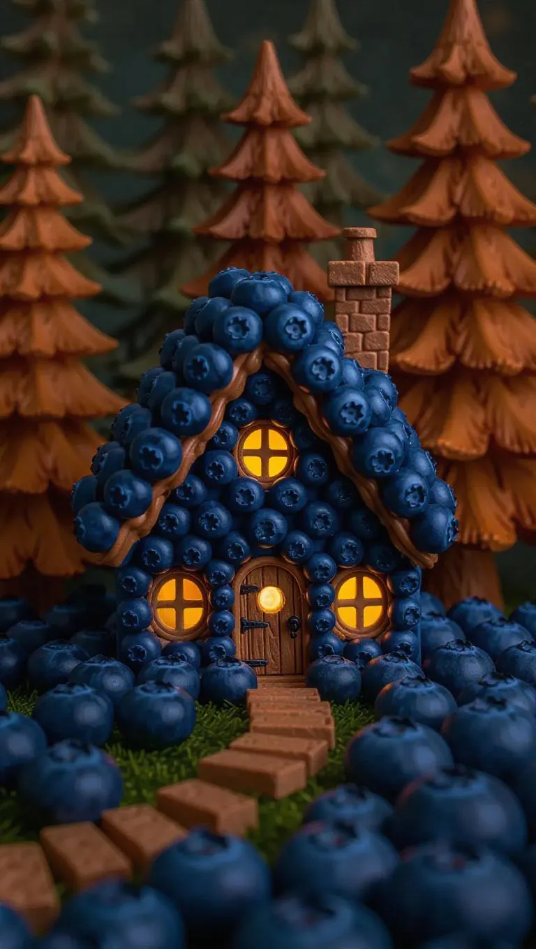 A whimsical little cottage crafted from plump blueberries and spicy cinnamon frosting, nestled in the heart of a cozy cabin, surrounded by a sea of rustic wooden trees and delicate wildlife, exuding a sweet, enchanting aroma.