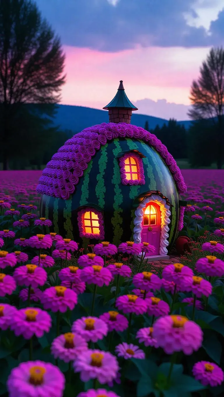 A whimsical little cottage crafted from plump watermelons and creamy frosting, nestled in the heart of a lush zinnia field, surrounded by a sea of vibrant pink zinnias and delicate wildflowers, exuding a sweet, enchanting aroma under the dusky light of evening.