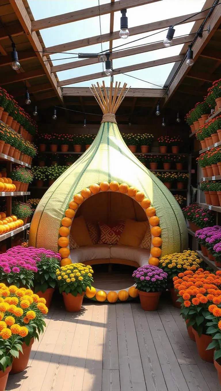 A whimsical little yurt crafted from vibrant cantaloupes and smooth cream, nestled in the heart of a cheerful flower market, surrounded by a sea of potted plants and artisanal goods, exuding a sweet, enchanting aroma in the lively atmosphere.