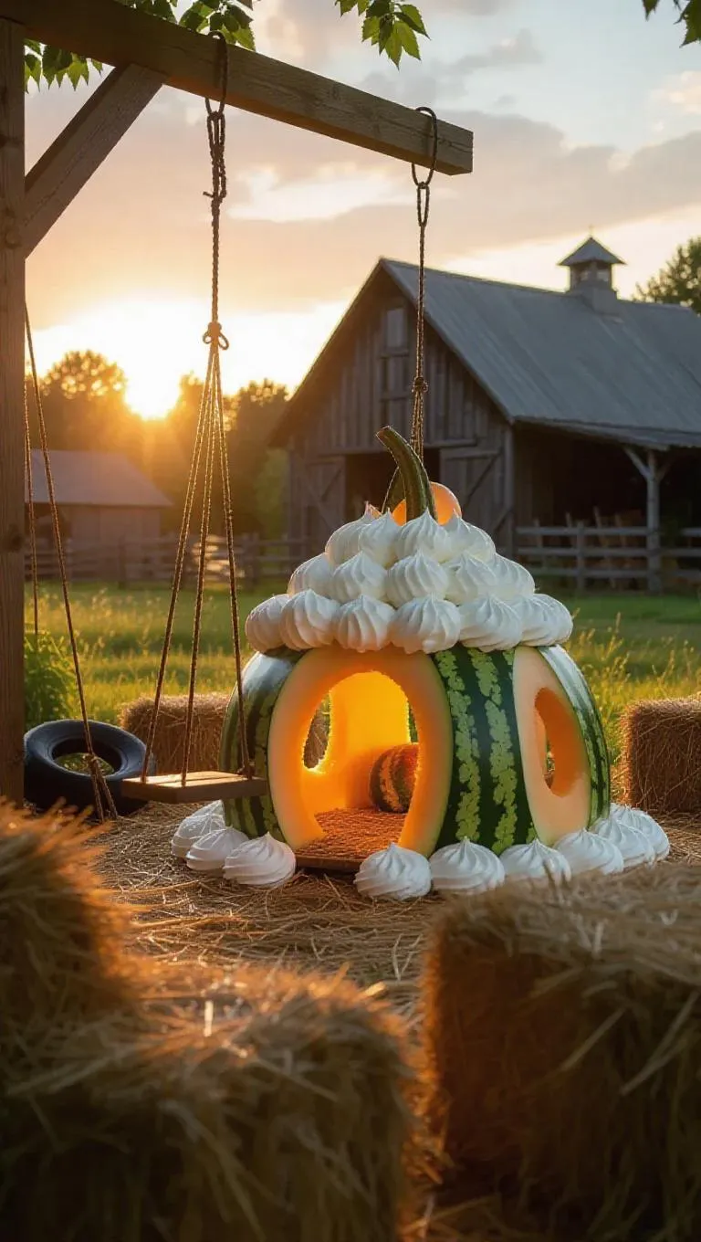 A whimsical little fortress crafted from sweet melons and soft whipped topping, nestled in the heart of a rustic barnyard, surrounded by a sea of fluffy hay bales and playful farm animals, with a tire swing hanging from a sturdy farmhouse porch, exuding a sweet, enchanting aroma under the cozy sunset sun.