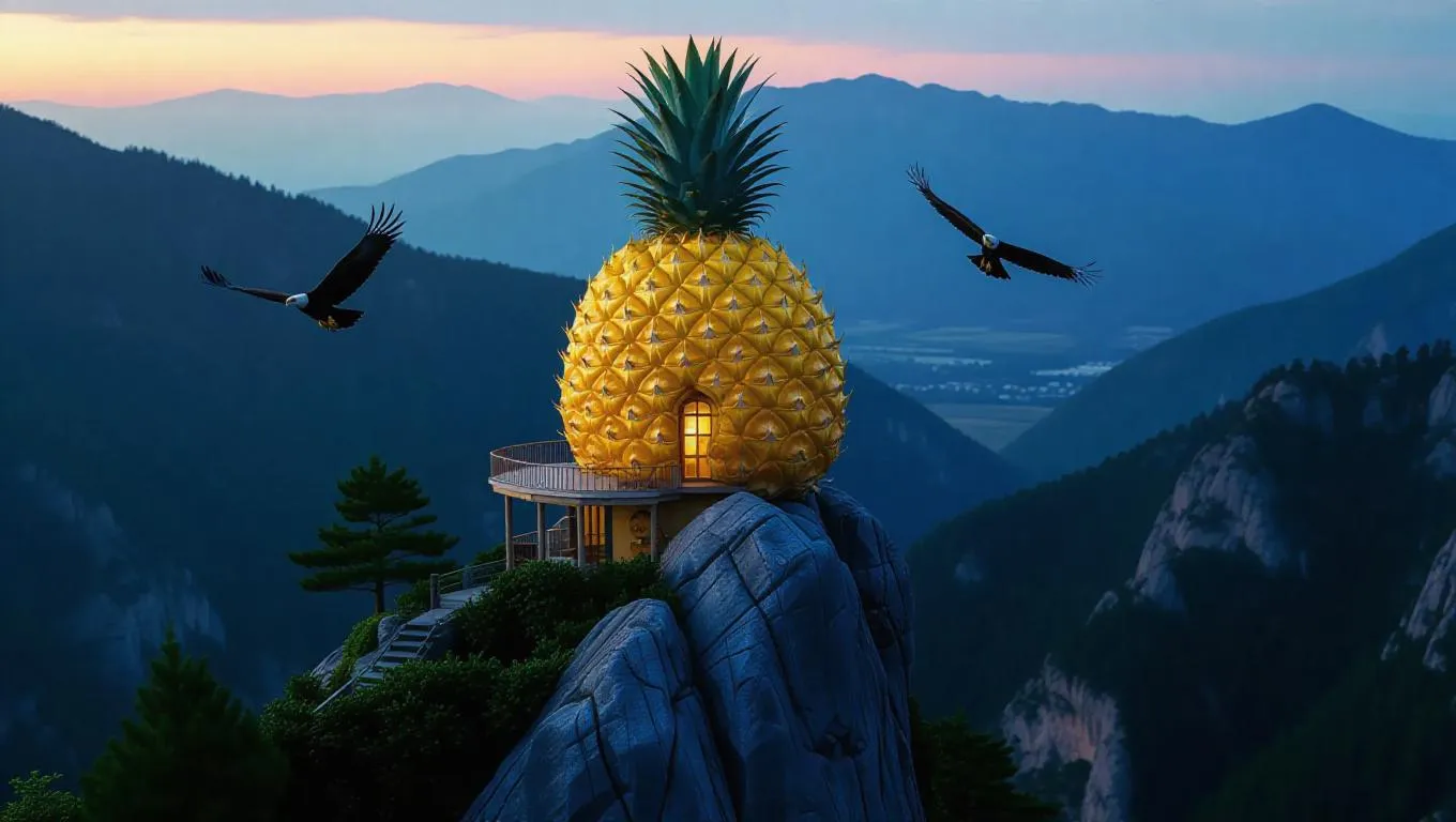 A pineapple-shaped house perched on a mountain peak, its golden yellow exterior and spiky green crown contrasting against the rugged terrain, windows glowing warmly as eagles soar above, creating a surreal and enchanting scene.