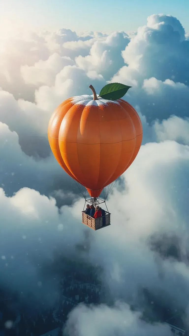 A whimsical peach-shaped blimp sailing through snowy winter skies, carrying bundled-up travelers. The blimp's vibrant hue contrasts with the cold, crisp clouds, creating a surreal and tranquil atmosphere. Sunlight filters through, casting a bright, wintry glow that enhances the enchanting experience.