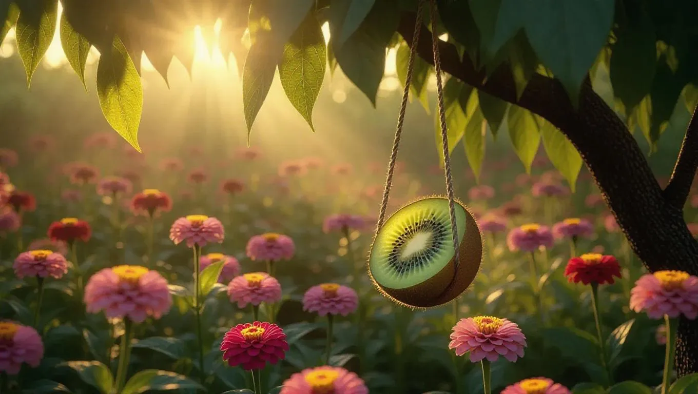 A whimsical half-kiwi-shaped swing hanging from a crooked fruit tree, surrounded by a vibrant meadow of zinnias in full bloom, creating a magical and serene atmosphere, with soft evening light filtering through the leaves, casting dappled shadows.
