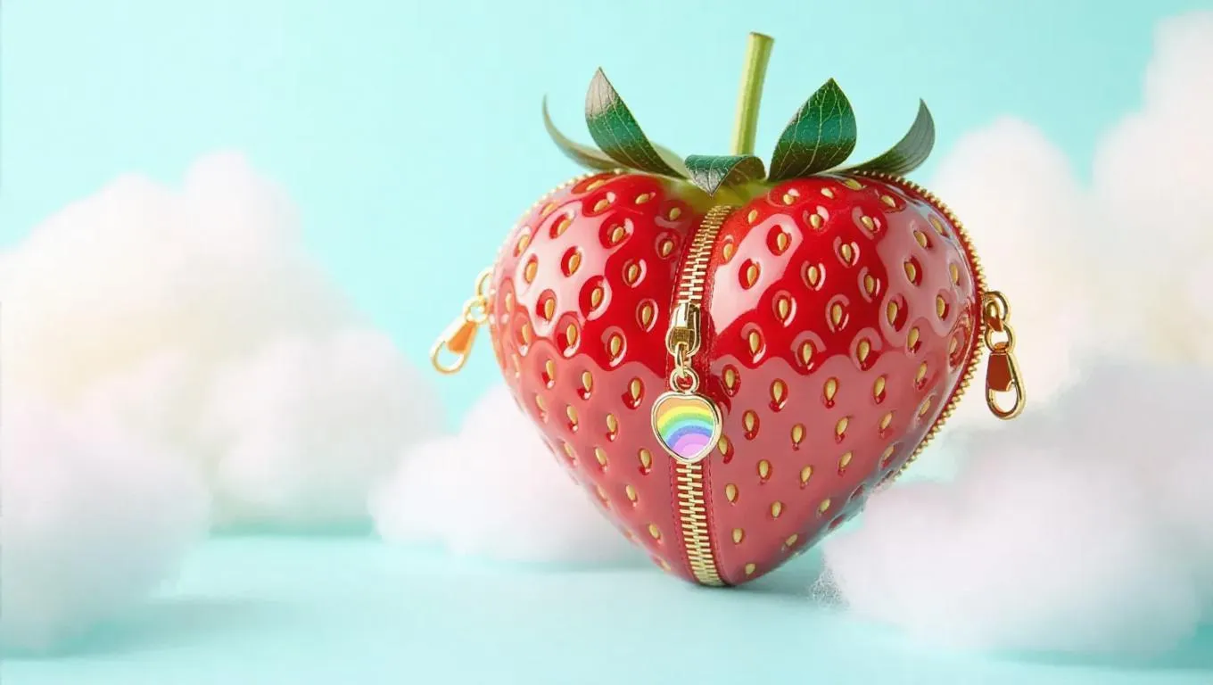 A heart-shaped strawberry handbag with golden zippers and a tiny rainbow charm, exuding a magical charm, set against a light turquoise backdrop, with whimsical cloud patterns and pastel, dreamy lighting.