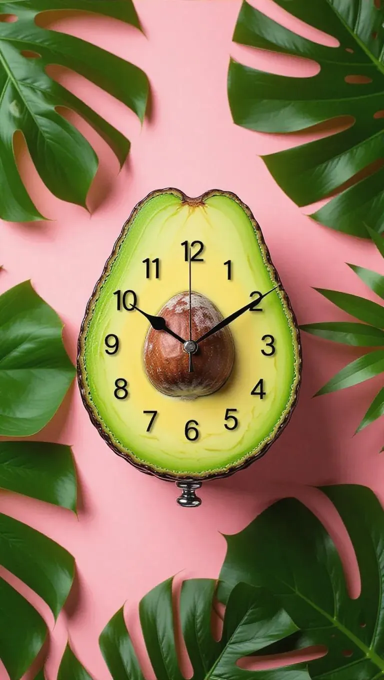 A whimsical clock shaped like a half avocado, with seed-shaped hour markers, resting on a lush tropical foliage backdrop, exuding a refreshing and playful summer vibe.