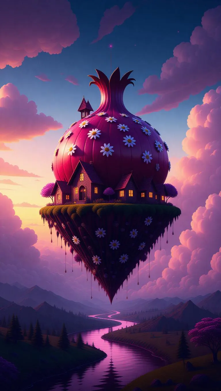 A whimsical floating pyramid shaped like a giant pomegranate, adorned with tiny daisy-shaped houses and rivers flowing with ruby juice, suspended under a bright evening sky, with fluffy clouds and a mild breeze.
