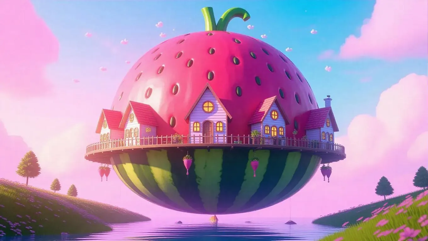 A whimsical floating library shaped like a giant watermelon, adorned with tiny sun-shaped houses and rivers flowing with vibrant juice, suspended under a dreamy pastel sky, with fluffy.