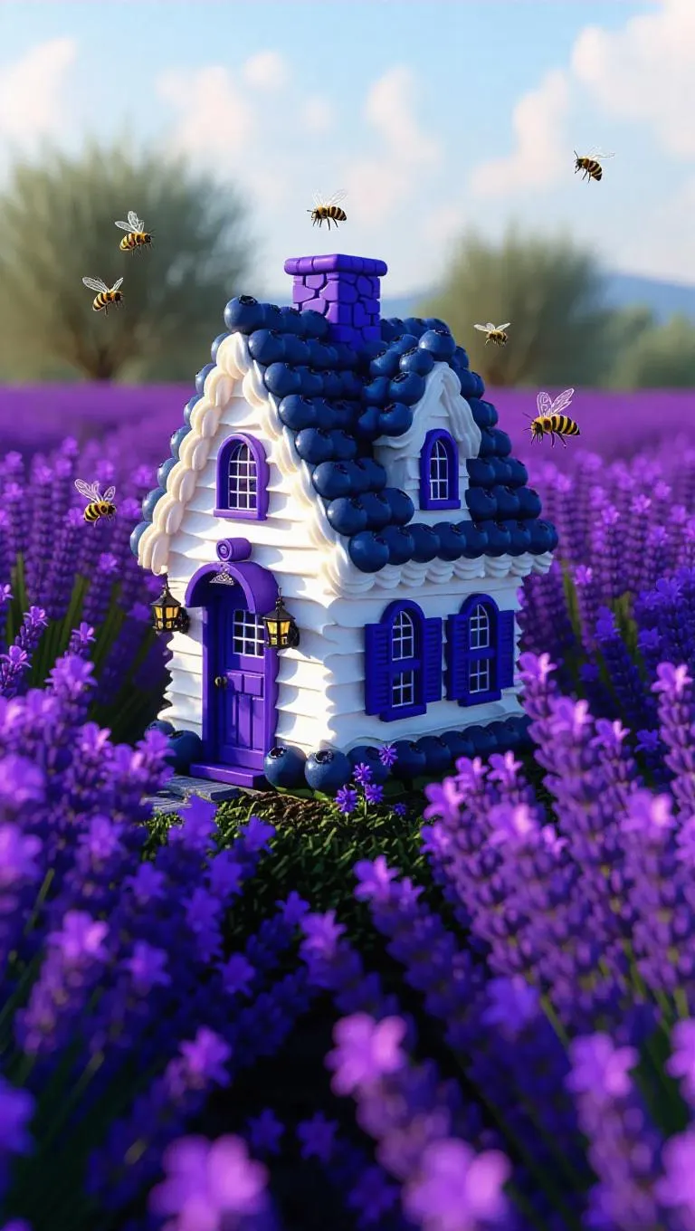 A whimsical little cottage crafted from plump blueberries and rich cream cheese frosting, nestled in the heart of an expansive lavender field, surrounded by a sea of vibrant purple blossoms and delicate bees, exuding a sweet, enchanting aroma.