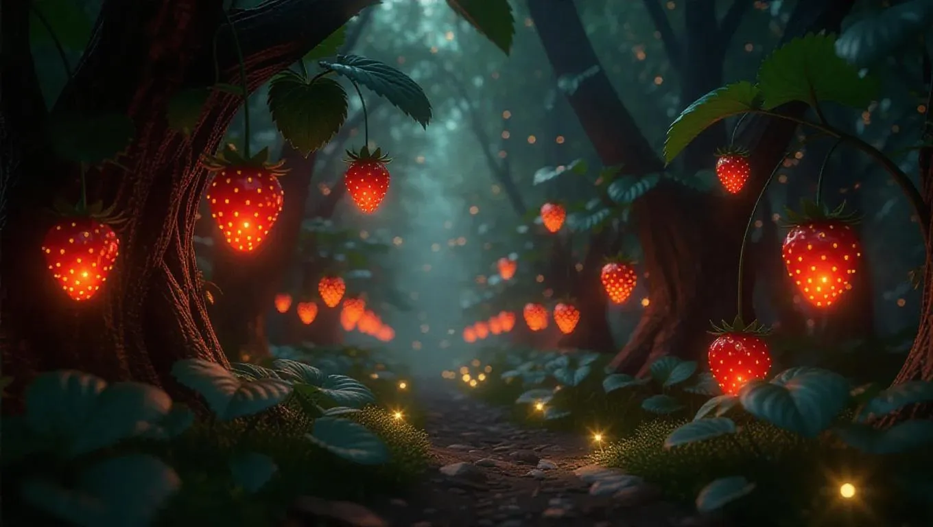An enchanting world where trees grow upside-down, strawberries hanging like glowing lanterns, casting a soft, warm light. The forest floor is scatterd with sparkling gems, and the air is filled with an enchanting, whimsical aroma. Twinkling fireflies dance around the strawberry-lanterns, adding a magical touch to the scene.