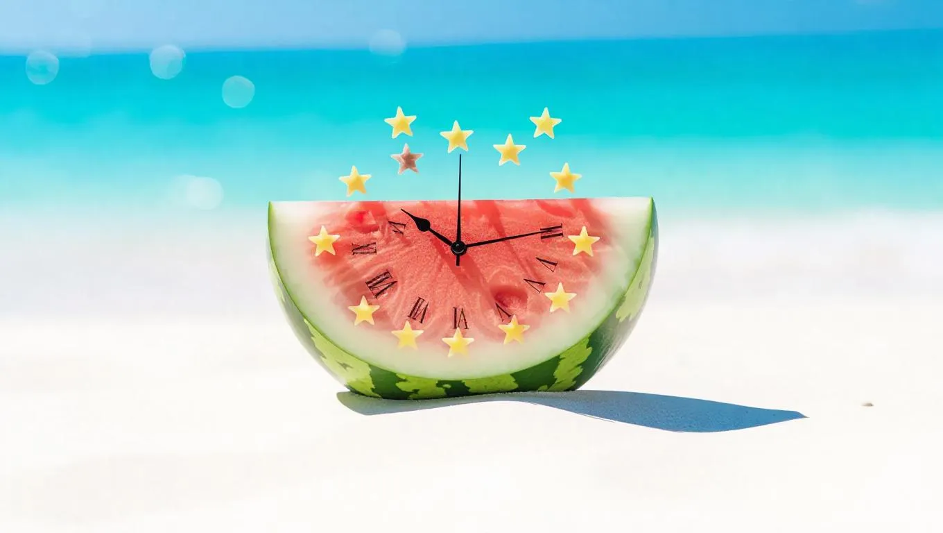 A whimsical clock shaped like a half watermelon, with star-shaped hour markers, resting on a sandy beach backdrop, exuding a relaxing and cheerful summer vibe.