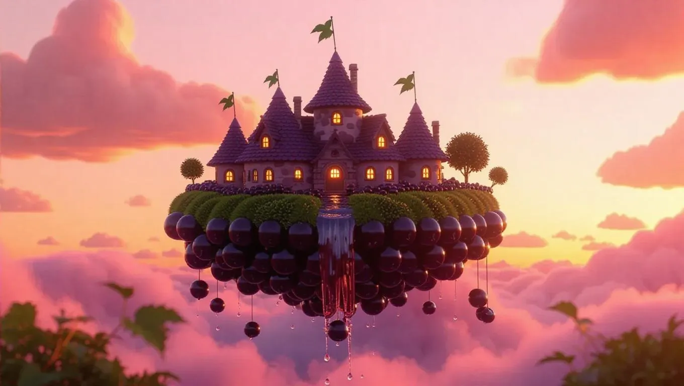A whimsical floating island shaped like a giant blackcurrant, adorned with tiny fruitcake-shaped houses and rivers flowing with rich blackcurrant juice, suspended under a soft pastel sunset sky, with gentle clouds and a gentle breeze