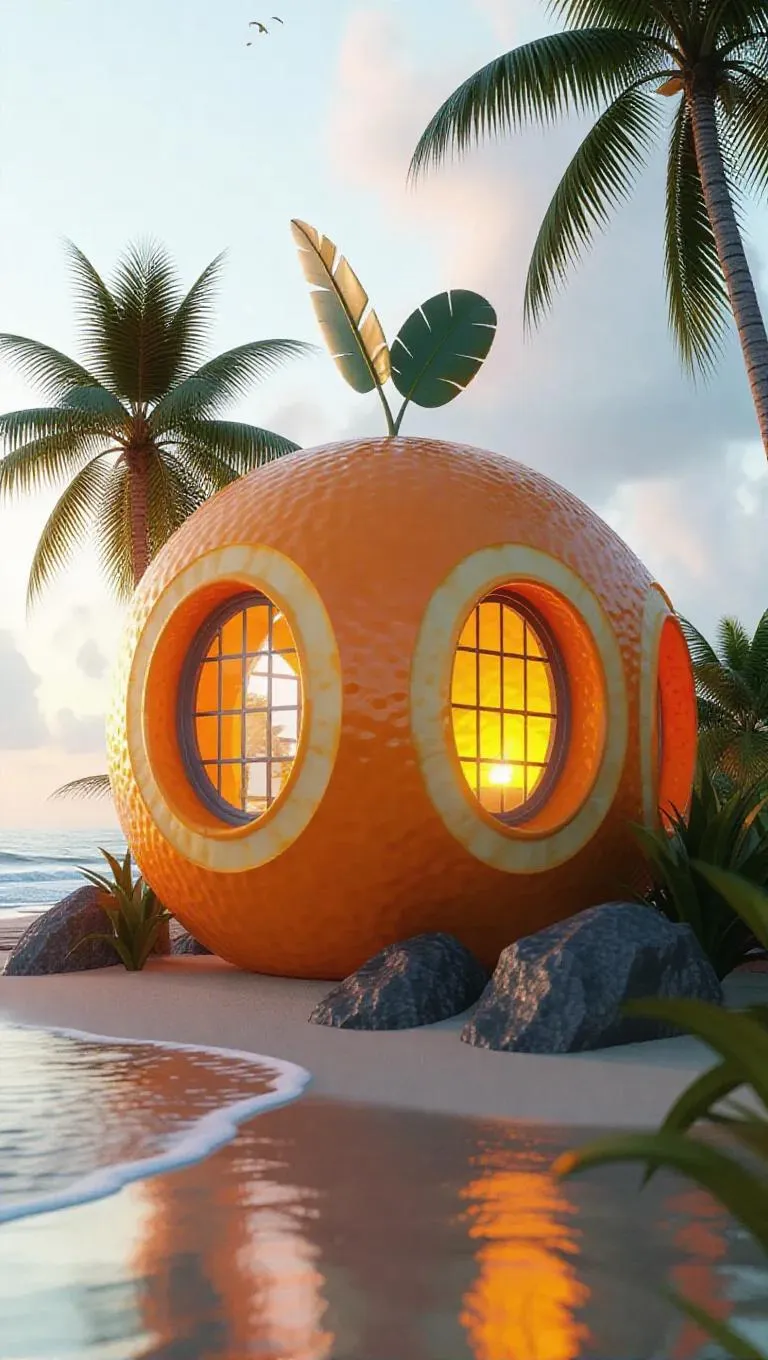 A whimsical house intricately carved from a giant orange, windows glowing brightly at night, surrounded by a tropical beach, with gentle waves and a warm breeze adding to the relaxing ambiance