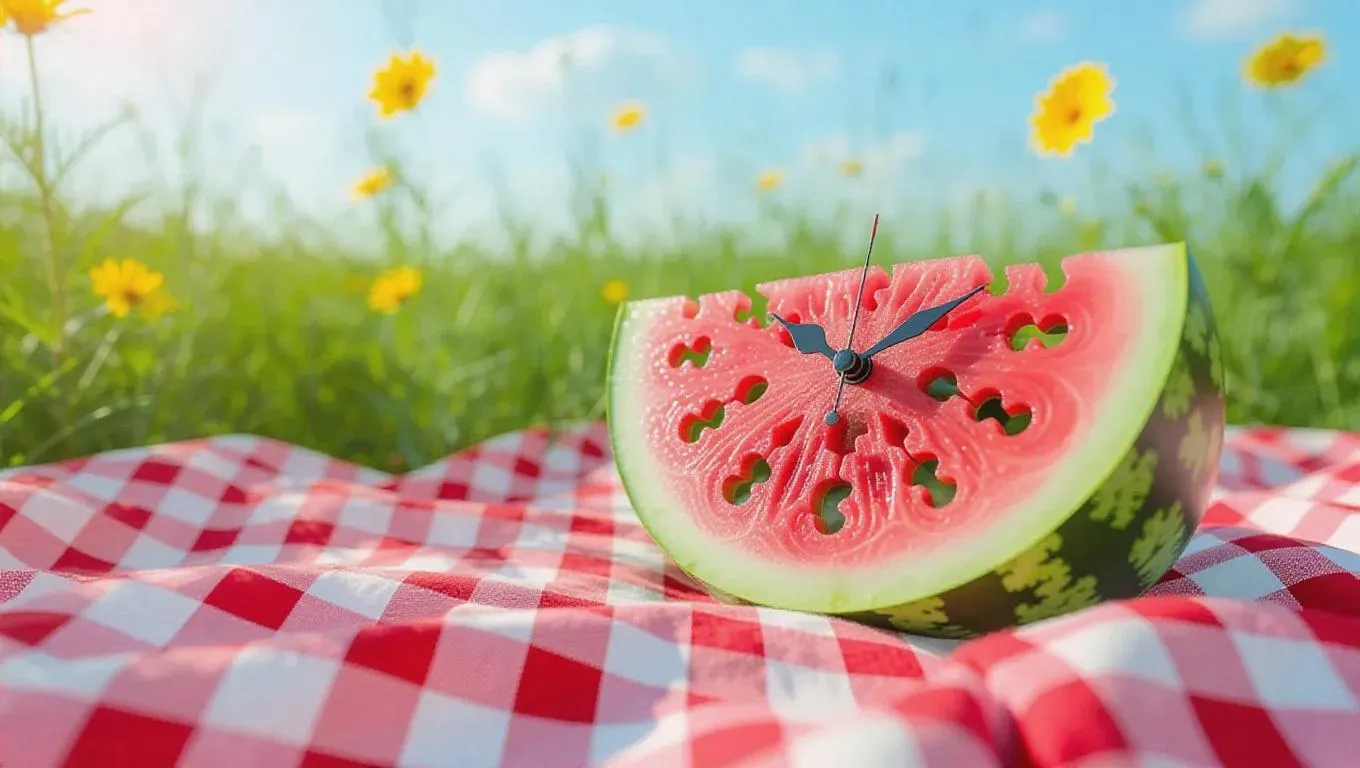 A whimsical clock shaped like a half watermelon, with puzzle piece hour markers, resting on a cozy picnic blanket backdrop, exuding a friendly and inviting summer vibe.