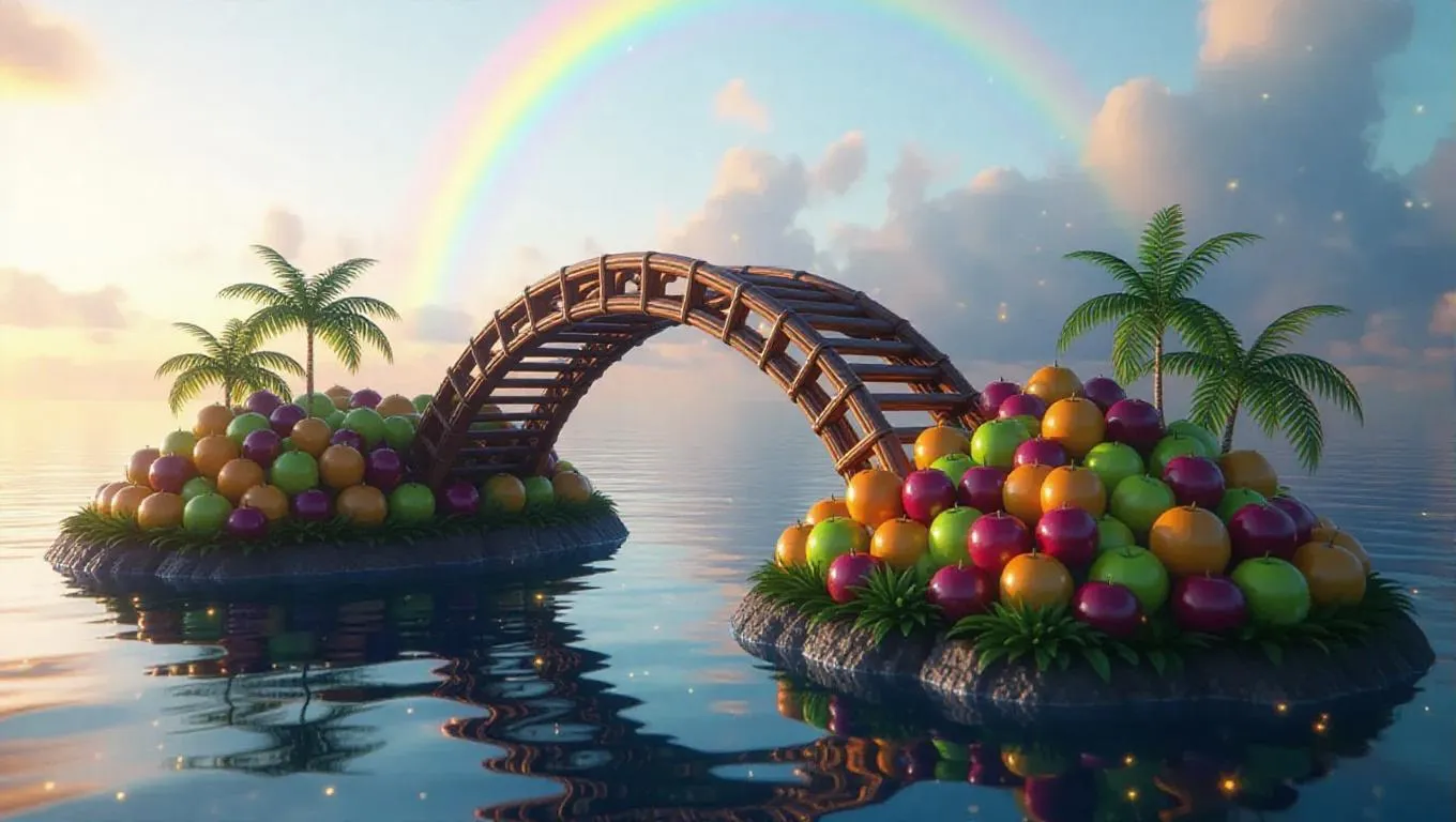 A whimsical bridge intricately woven from shimmering dates, connecting two floating fruit islands adorned with vibrant, sweet fruits. The islands hover above a magical, enchanted sea, with a rainbow arching overhead and glowing fireflies dancing around the bridge.