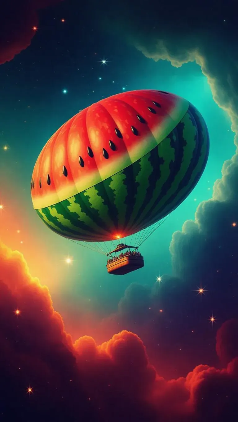 A whimsical watermelon-shaped blimp gracefully gliding through a cosmic starlit sky, carrying delighted travelers. The blimp's vibrant green and red hues contrast with swirling galaxies, creating a surreal and enchanting atmosphere. Stars twinkle brightly, casting a dazzling light that enhances the magical journey