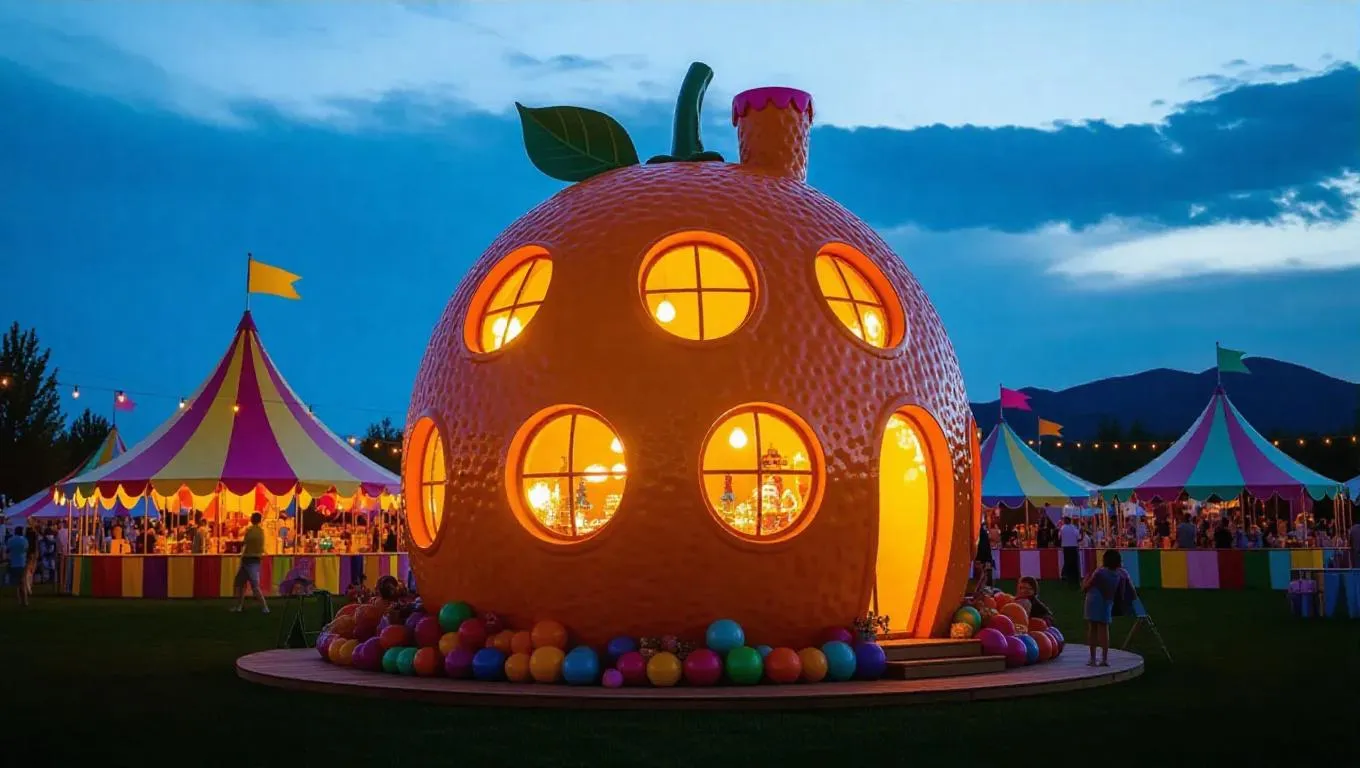 A whimsical house intricately carved from a giant orange, windows glowing warmly at night, surrounded by a colorful carnival, with vibrant tents and joyous music adding to the festive ambiance