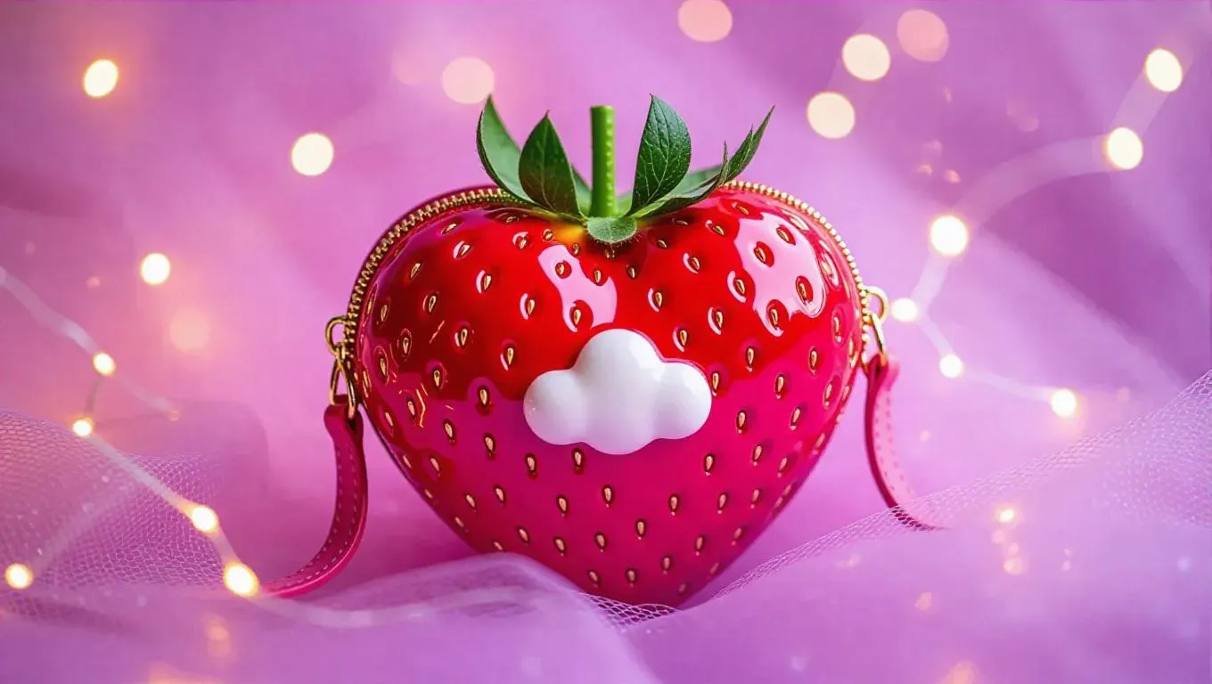 A heart-shaped strawberry handbag with golden zippers and a tiny cloud charm, exuding a dreamy charm, set against a gentle lilac backdrop, with whimsical star patterns and soft, glowing lighting.