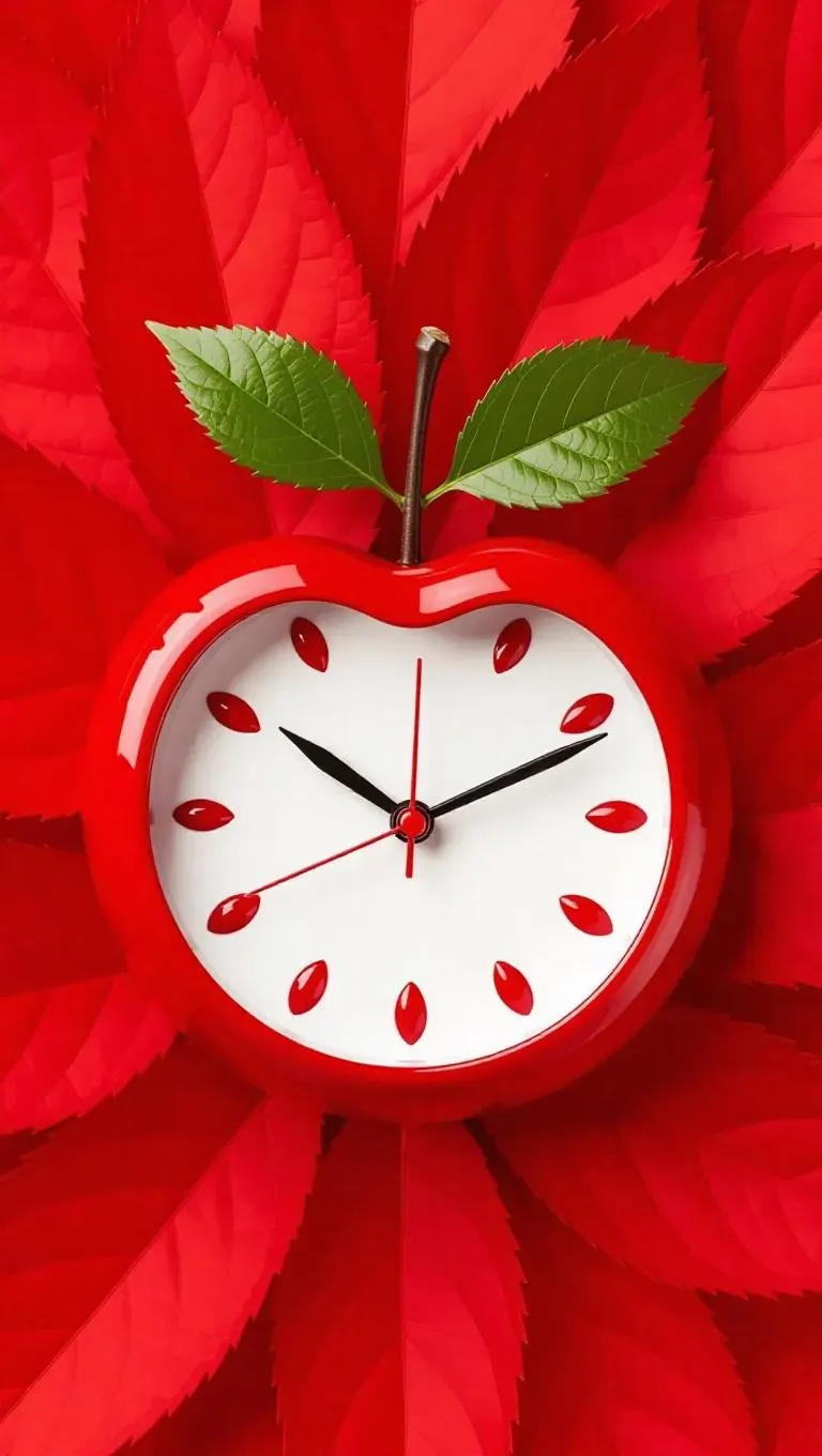 A whimsical clock shaped like a half cherry, with seed-shaped hour markers, resting on a vibrant red leafy backdrop, exuding a refreshing and playful summer vibe.