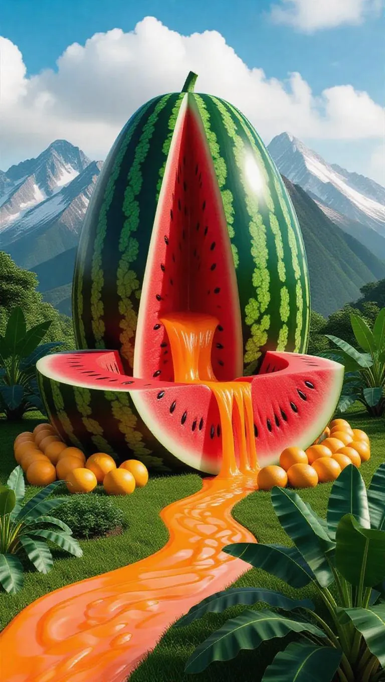 A mountain carved from a giant watermelon, with citrus-flavored juice cascading down its peak, surrounded by mango groves and banana meadows.