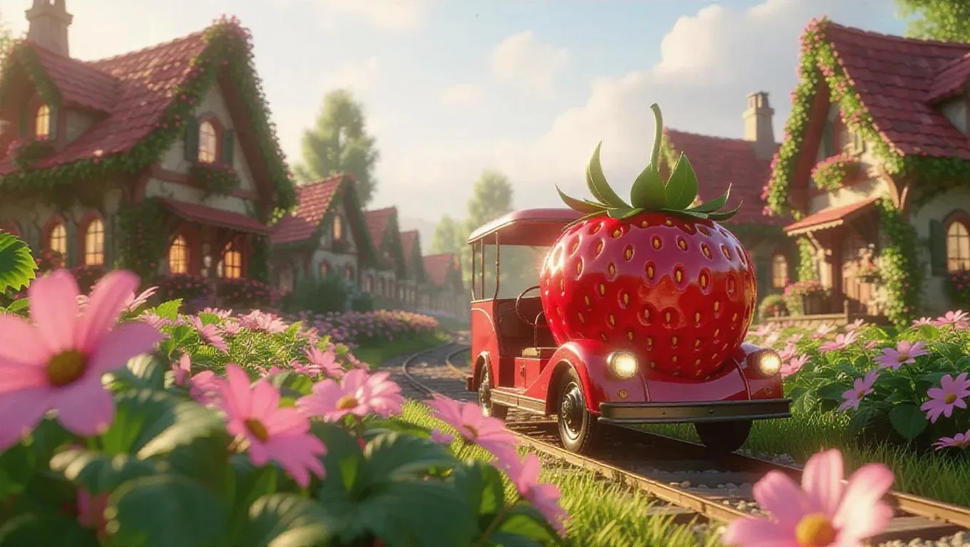 An imaginative strawberry-shaped ride traversing a serene village surrounded by vivid flower landscapes, unfolding a magical trail of glimmering berry dust, as sunlight streams through pale skies and happy residents wave from their floral dwellings