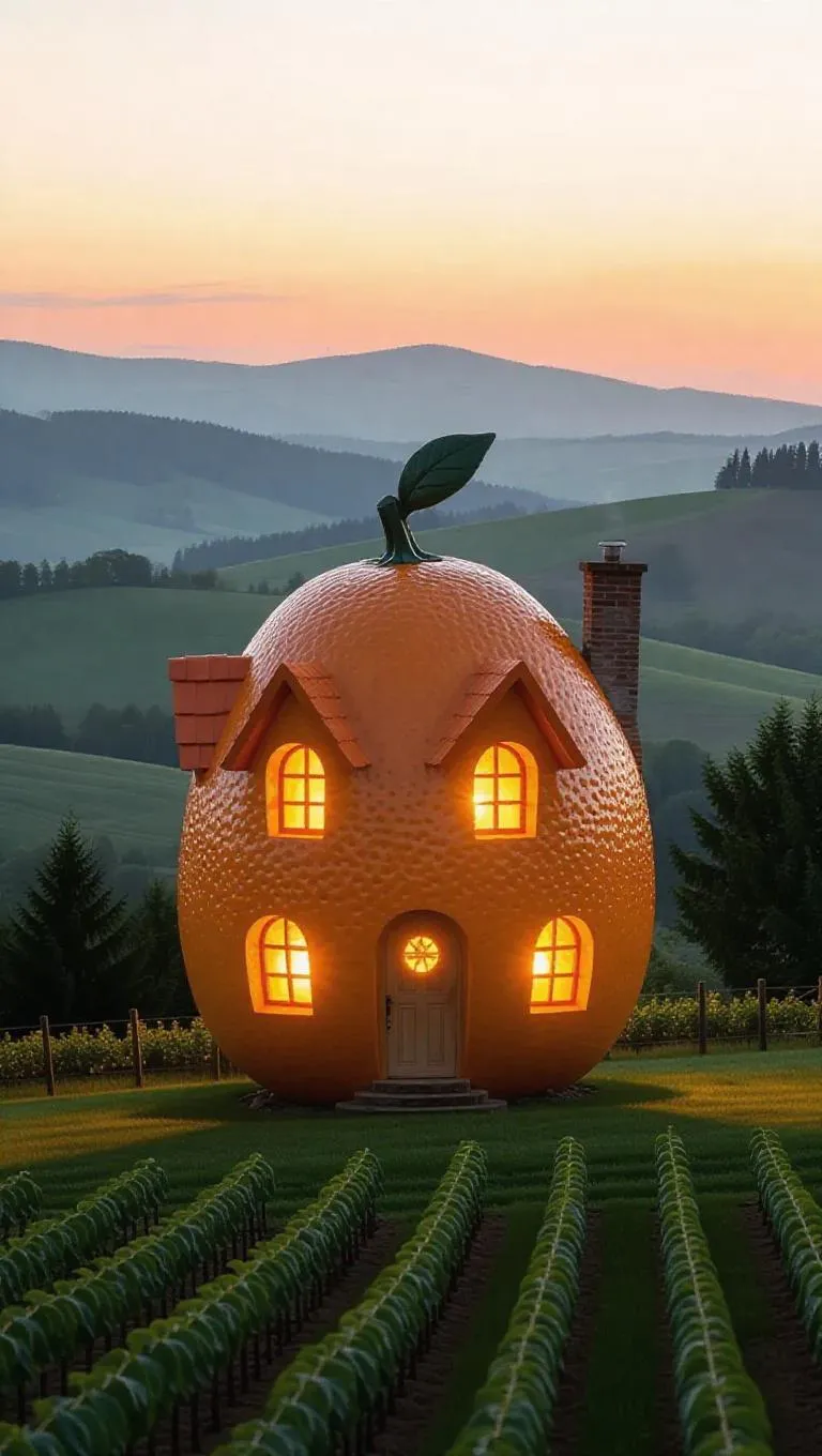 A whimsical house intricately carved from a giant orange, windows glowing gently at dawn, surrounded by a peaceful countryside, with rolling hills and a soft golden light adding to the pastoral ambiance
