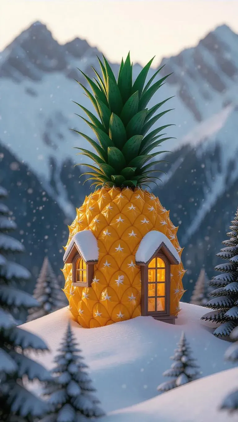 A pineapple-shaped house perched on a snowy mountain, its golden yellow exterior and spiky green crown a bright spot in the white landscape, windows glowing warmly as snowflakes drift down, creating a surreal and enchanting scene.