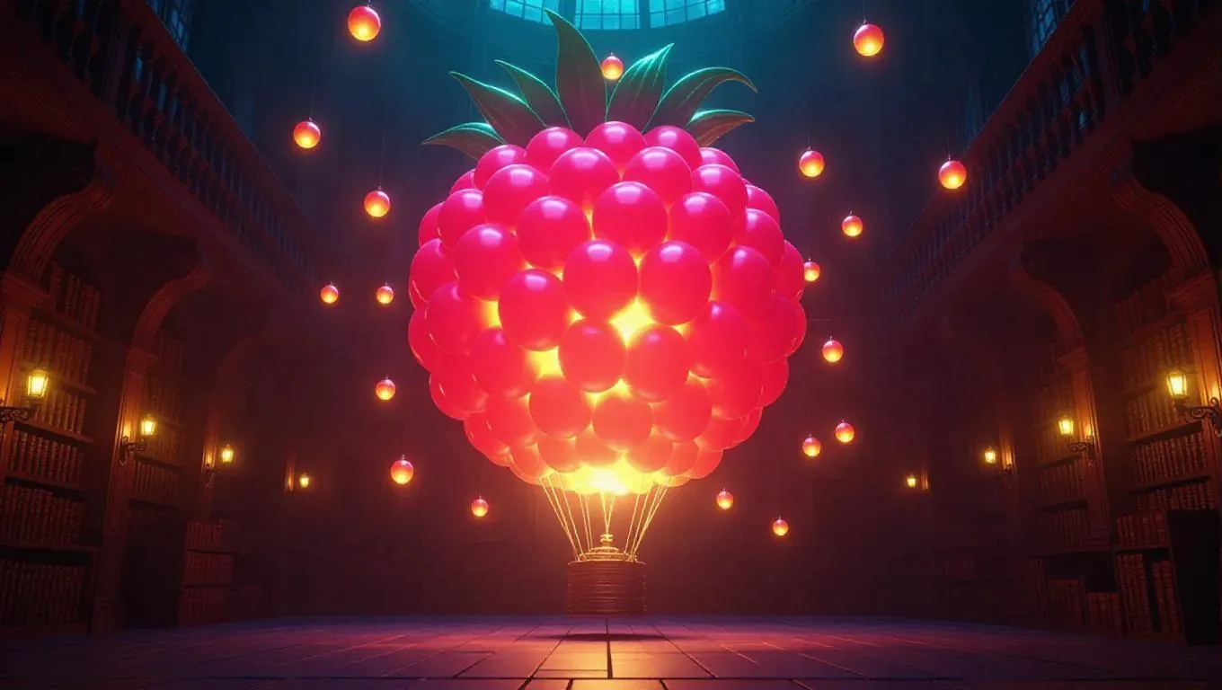 A mystical balloon nestled within a colossal raspberry core, illuminated by glowing fruit scrolls that radiate soft, golden light. Floating bookworms sip nectar from the scrolls, creating a whimsical and enchanting atmosphere. The walls are lined with ancient tomes and whimsical carvings, enhancing the magical ambiance.