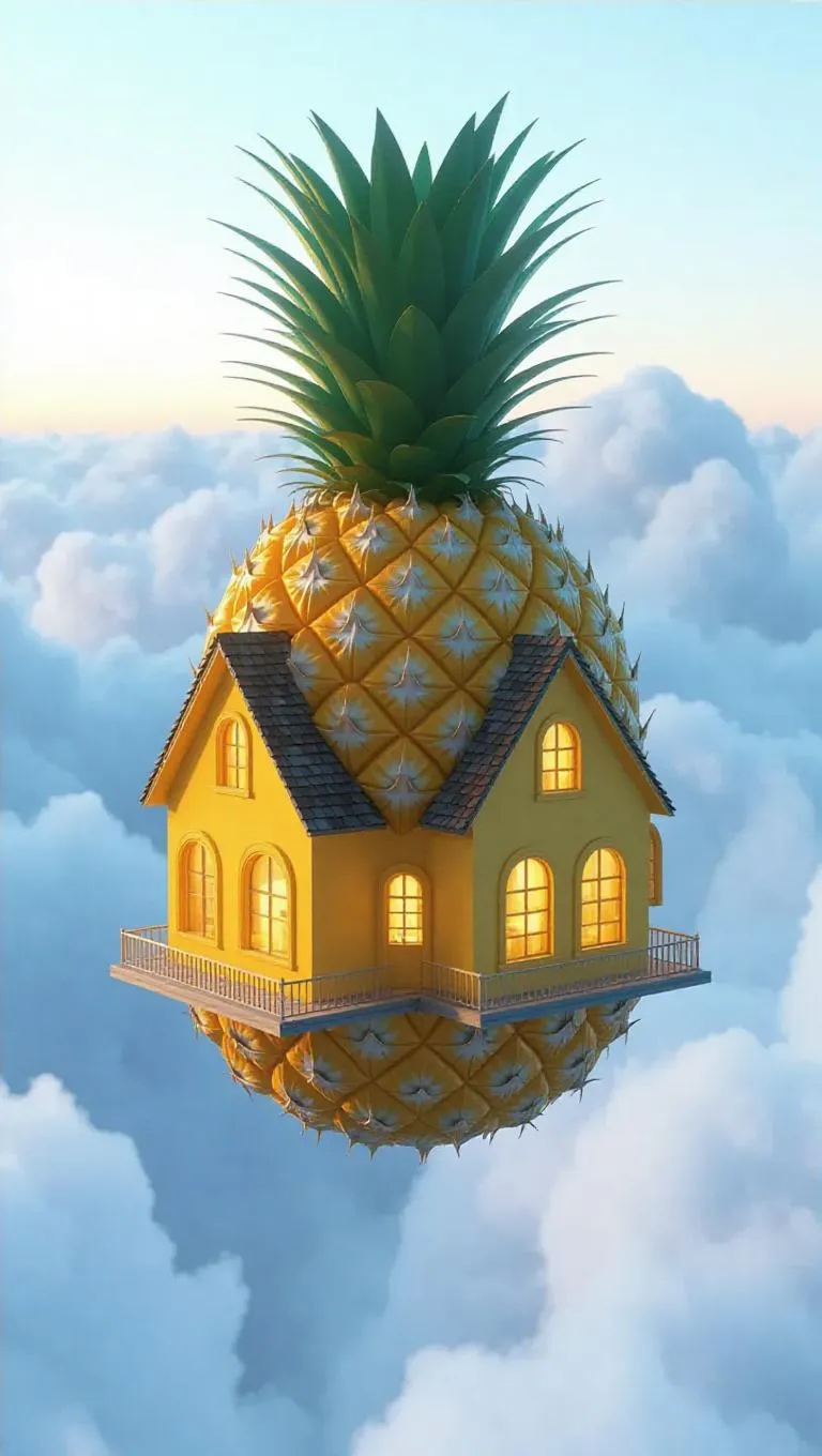 A pineapple-shaped house floating in the air, its golden yellow exterior and spiky green crown defying gravity, windows glowing warmly as clouds drift by, creating a surreal and enchanting scene.