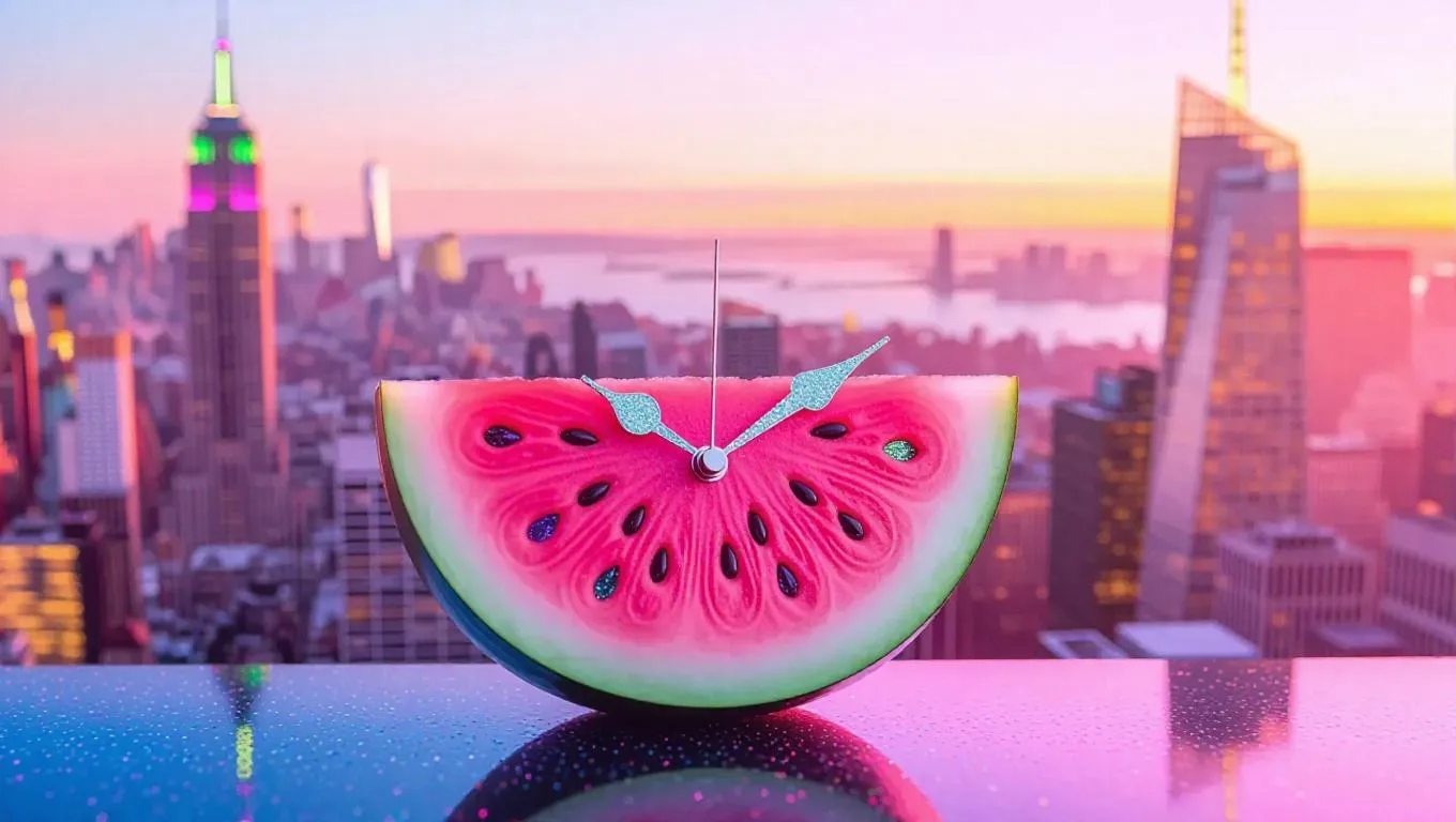 A whimsical clock shaped like a half watermelon, with rainbow-shaped hour markers, resting on a glittering city skyline backdrop, exuding a vibrant and dynamic summer vibe.