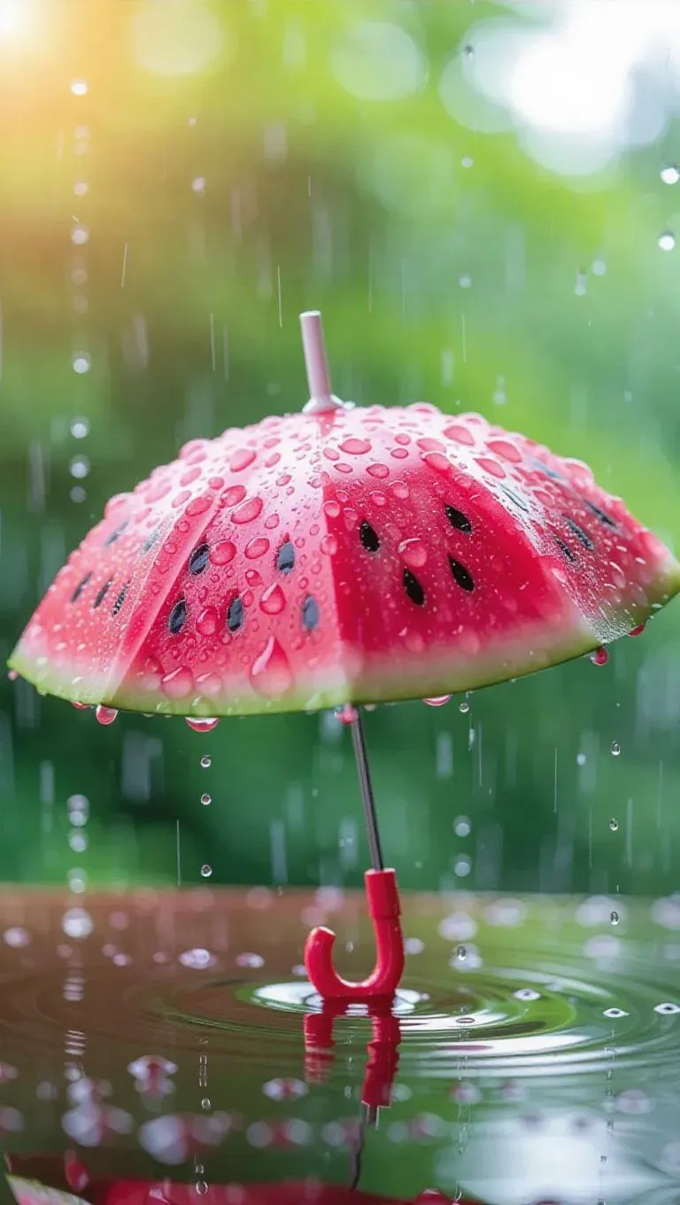 A whimsical umbrella shaped like a watermelon slice, closed under a gentle drizzle, with droplets lovingly resting on its vibrant pink and green surface, set against a sunny, cheerful backdrop.