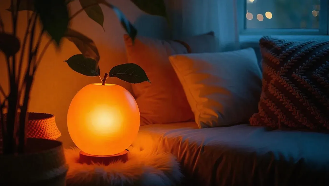 A whimsical lamp shaped like a glowing peach, casting a warm, ambient light in a cozy corner, surrounded by plush cushions and soft textiles, creating a serene and inviting atmosphere.