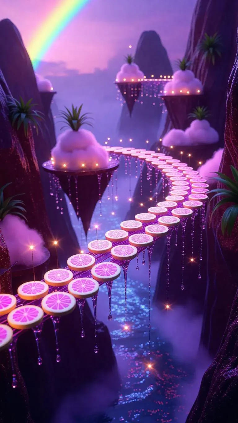 A whimsical bridge intricately woven from iridescent starfruit slices, connecting two floating fruit islands adorned with bubblegum-pink cotton candy. The islands hover above a misty, enchanted desert oasis, with a rainbow arching overhead and glowing fireflies dancing around the bridge.