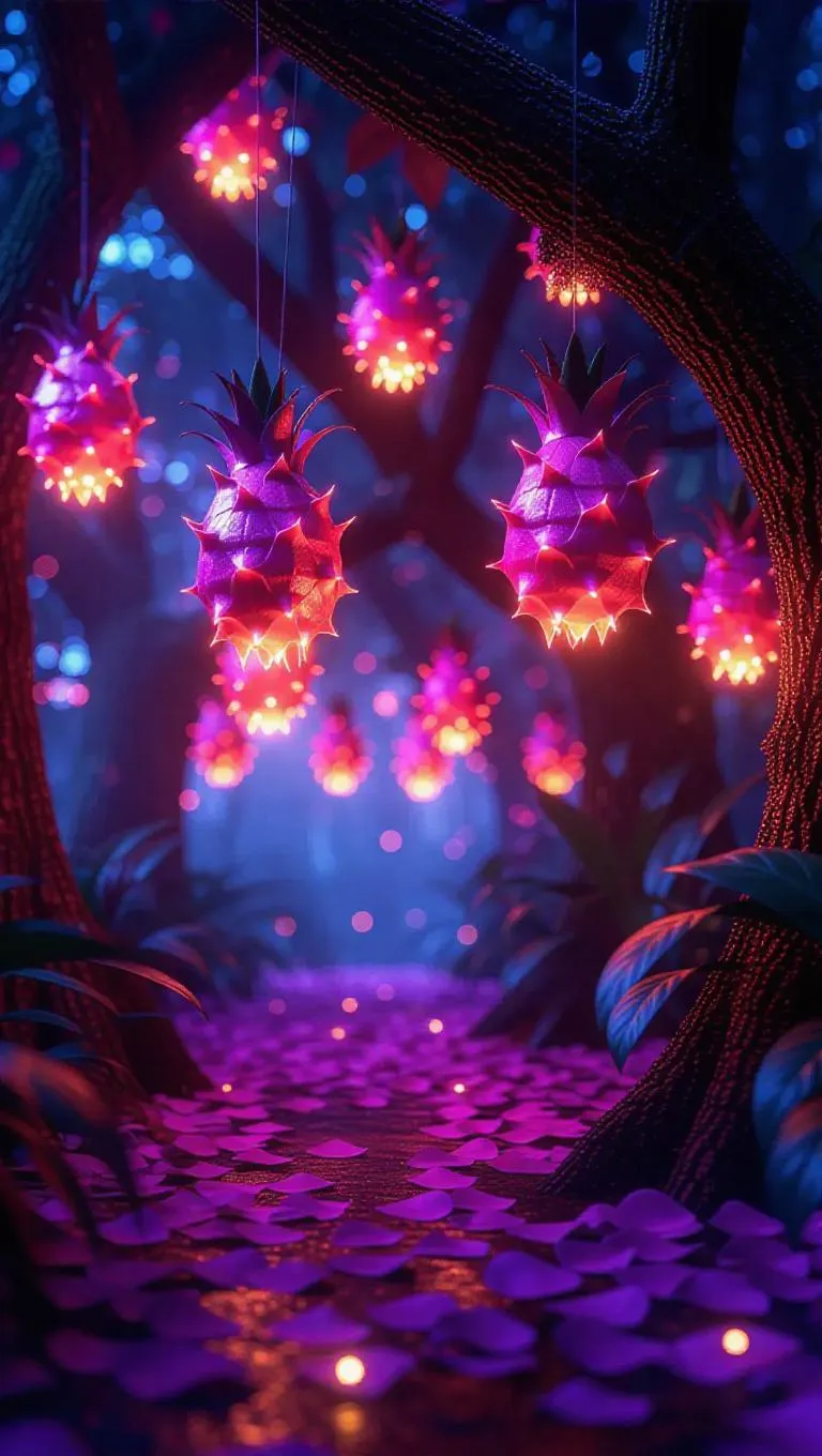 n enchanting world where trees grow upside-down, dragon fruits hanging like glowing lanterns, casting a soft, warm light. The forest floor is carpeted with deep purple petals, and the air is filled with a sweet, exotic aroma. Twinkling fireflies dance around the dragon fruit lanterns, adding a magical touch to the scene.