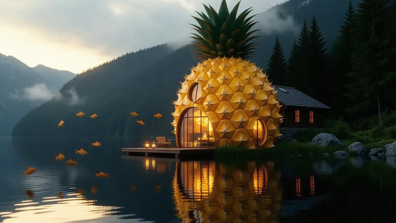 A pineapple-shaped house by a lake, its golden yellow exterior and spiky green crown reflecting in the water, windows glowing warmly as fish jump around, creating a surreal and enchanting scene.
