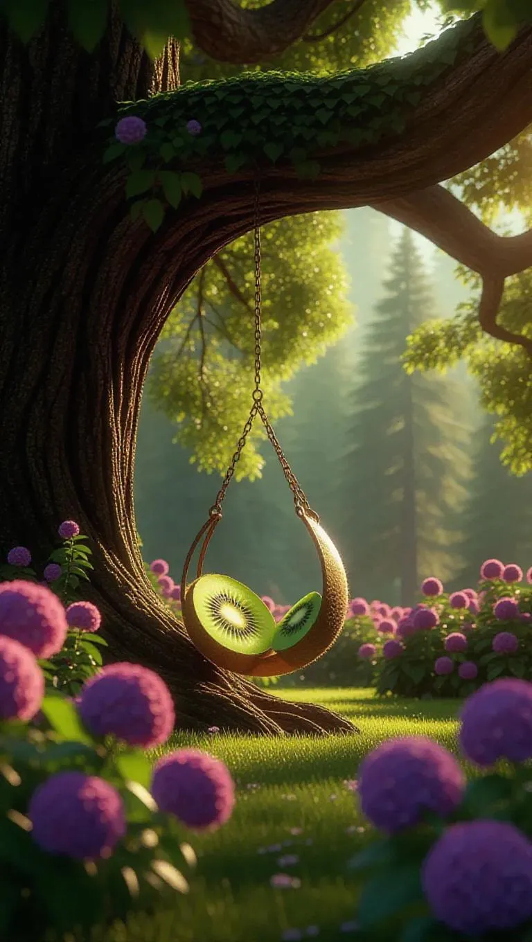 A whimsical half-kiwi-shaped swing hanging from a majestic sequoia tree, surrounded by a vibrant meadow of hydrangeas in full bloom, creating a magical and serene atmosphere, with bright afternoon light filtering through the leaves, casting dappled shadows.