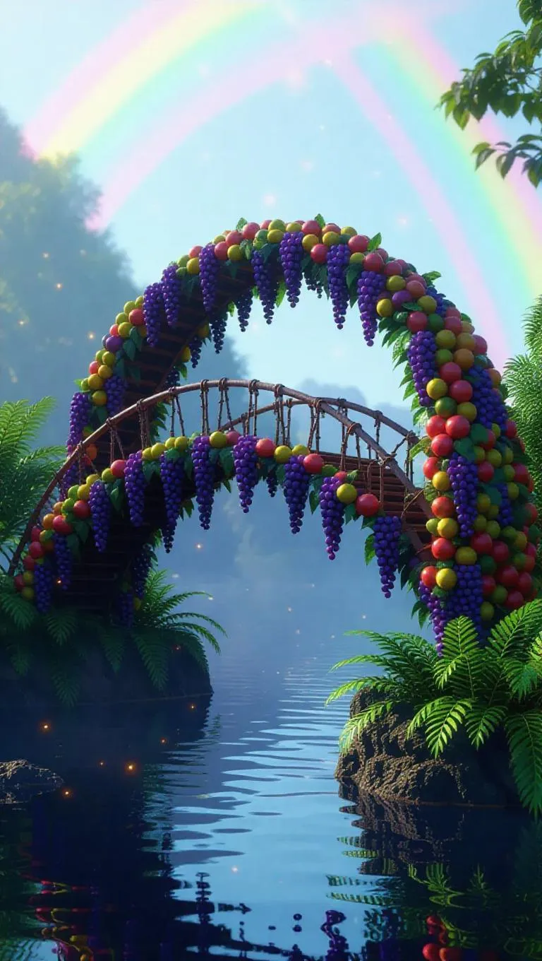 A whimsical bridge intricately woven from shimmering grape vines, connecting two floating fruit islands adorned with tropical, vibrant fruits. The islands hover above a misty, magical sea, with a rainbow arching overhead and glowing fireflies dancing around the bridge.