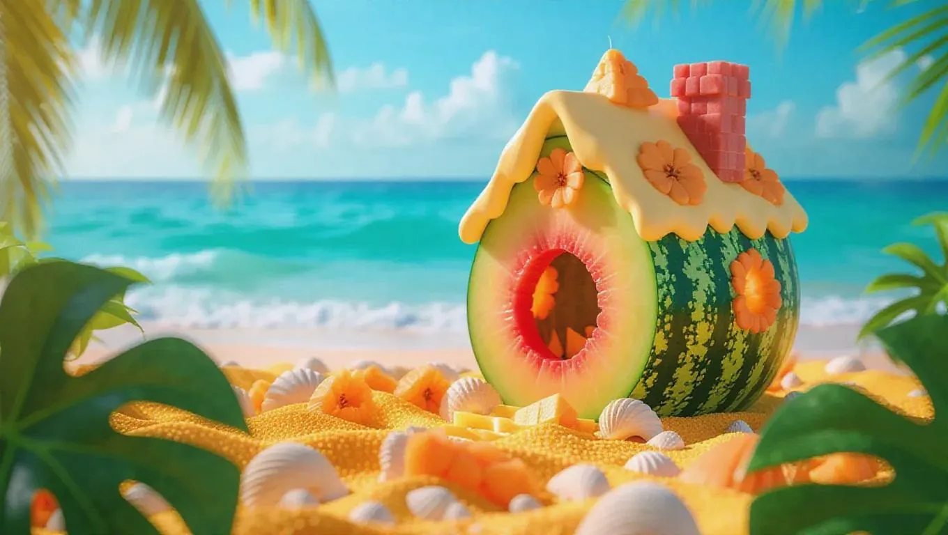 A whimsical little cottage crafted from juicy melons and creamy icing, nestled in the heart of a tropical beach, surrounded by a sea of bright yellow sand and delicate seashells, exuding a sweet, enchanting aroma.