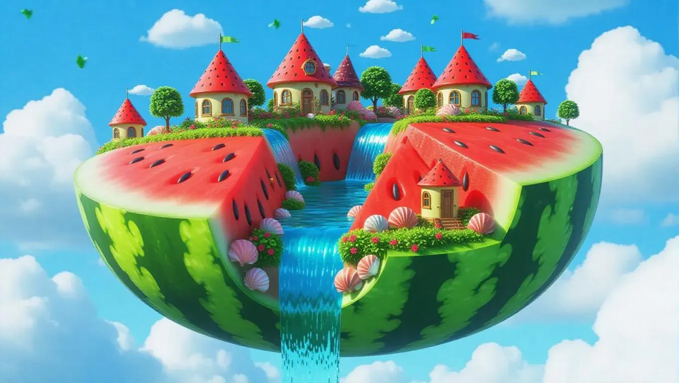 A vibrant floating island shaped like a giant watermelon, adorned with tiny shell-shaped houses and rivers flowing with juicy refreshment, suspended under a clear blue sky, with fluffy clouds and a gentle breeze