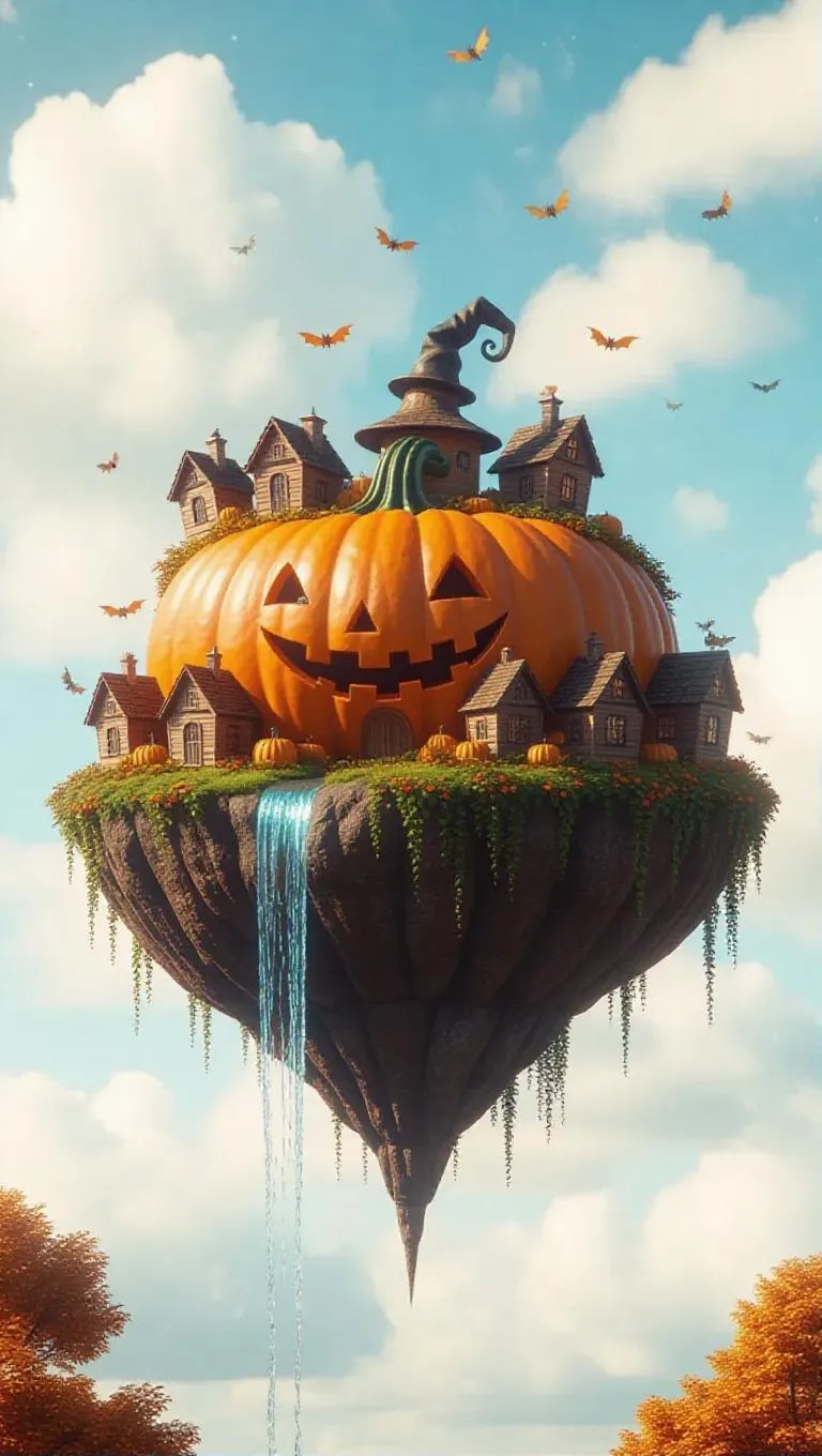A delightful floating island shaped like a giant pumpkin, adorned with tiny scarecrow-shaped houses and rivers flowing with pumpkin spice, suspended under an autumnal sky, with colorful clouds and a gentle breeze