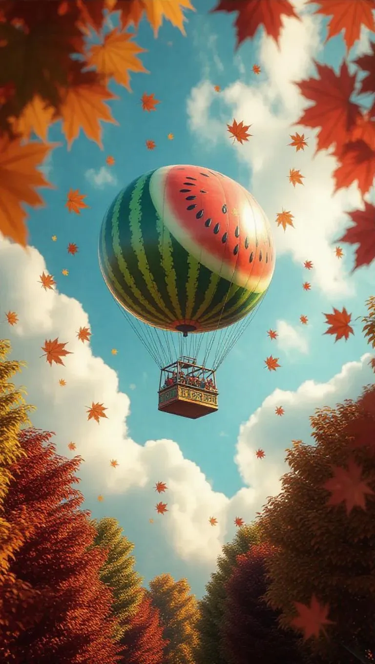 A whimsical watermelon-shaped blimp gliding through a colorful autumn sky, carrying delighted travelers. The blimp's vibrant green and red hues contrast with golden and crimson leaves, creating a surreal and enchanting atmosphere. Autumn sunlight filters through, casting a warm, inviting glow that enhances the magical journey